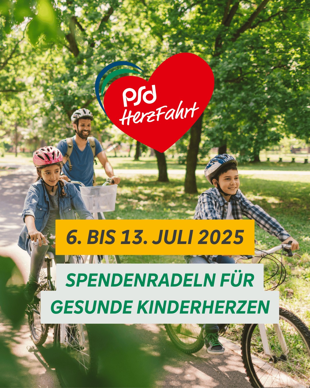 Bei dem jährlichen Spendenradeln unseres Kooperationspartners PSD Bank treten Jung und Alt, Sport- und Freizeitradler für den guten Zweck in die Pedale. Für jeden Kilometer geht eine Spende der PSD Bank Berlin-Brandenburg an die Klinik für angeborene Herzfehler am Deutschen Herzzentrum der Charité.