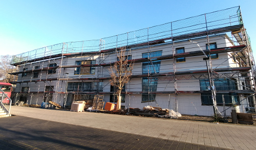 Kurz vor Weihnachten geben die Handwerker auf der Baustelle des Vereinszentrums noch einmal alles. Die Fassade ist frisch verputzt und leuchtet strahlend weiß.