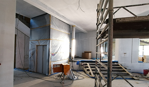 Im Inneren des Gebäudes haben die Maler einen ersten Grundierungsanstrich auf die Wände gebracht. Der neue Fahrstuhl ist sicher verpackt.
