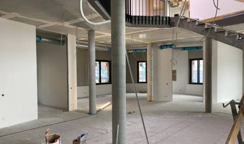 Mittlerweile fallen die Veränderungen im Inneren des Neubaus nicht mehr sofort ins Auge. Man muss schon etwas genauer hinschauen. Die Bauarbeiter sind weiterhin fleißig dabei, die letzten Arbeiten abzuschließen. So sind im Obergeschoss noch die Fliesenleger beschäftigt, während auf der anderen Gebäudeseite die Fußböden geglättet werden.