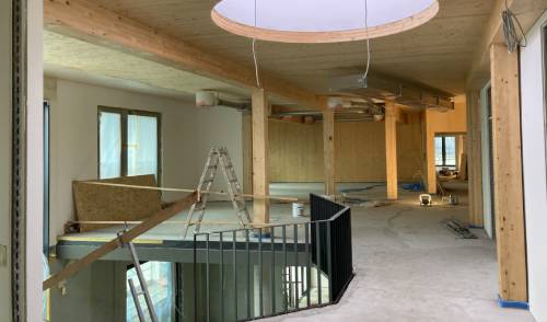 An der Treppe im Obergeschoss wurde schon ein Stück des Geländers montiert.