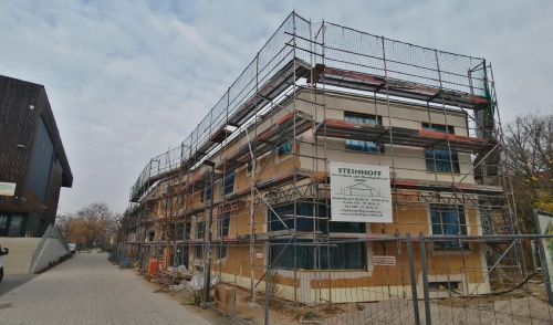 Die Trockenbauer sind dabei, die letzten Wände zu stellen und zu verspachteln, der Fahrstuhl wird gerade montiert und die Elektriker ziehen Leitungen und Anschlüsse. Außen werden die Wände verputzt und Erdarbeiten zum Hochwasserschutz ausgeführt.