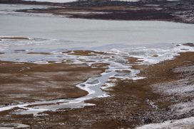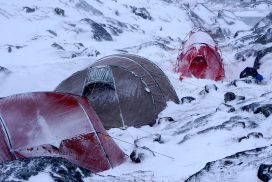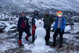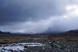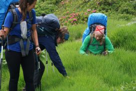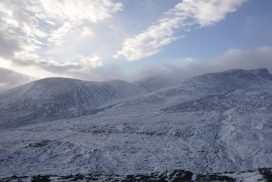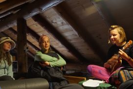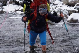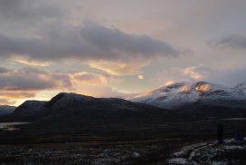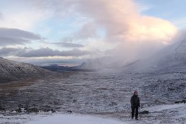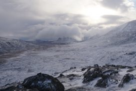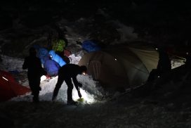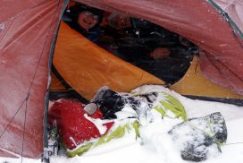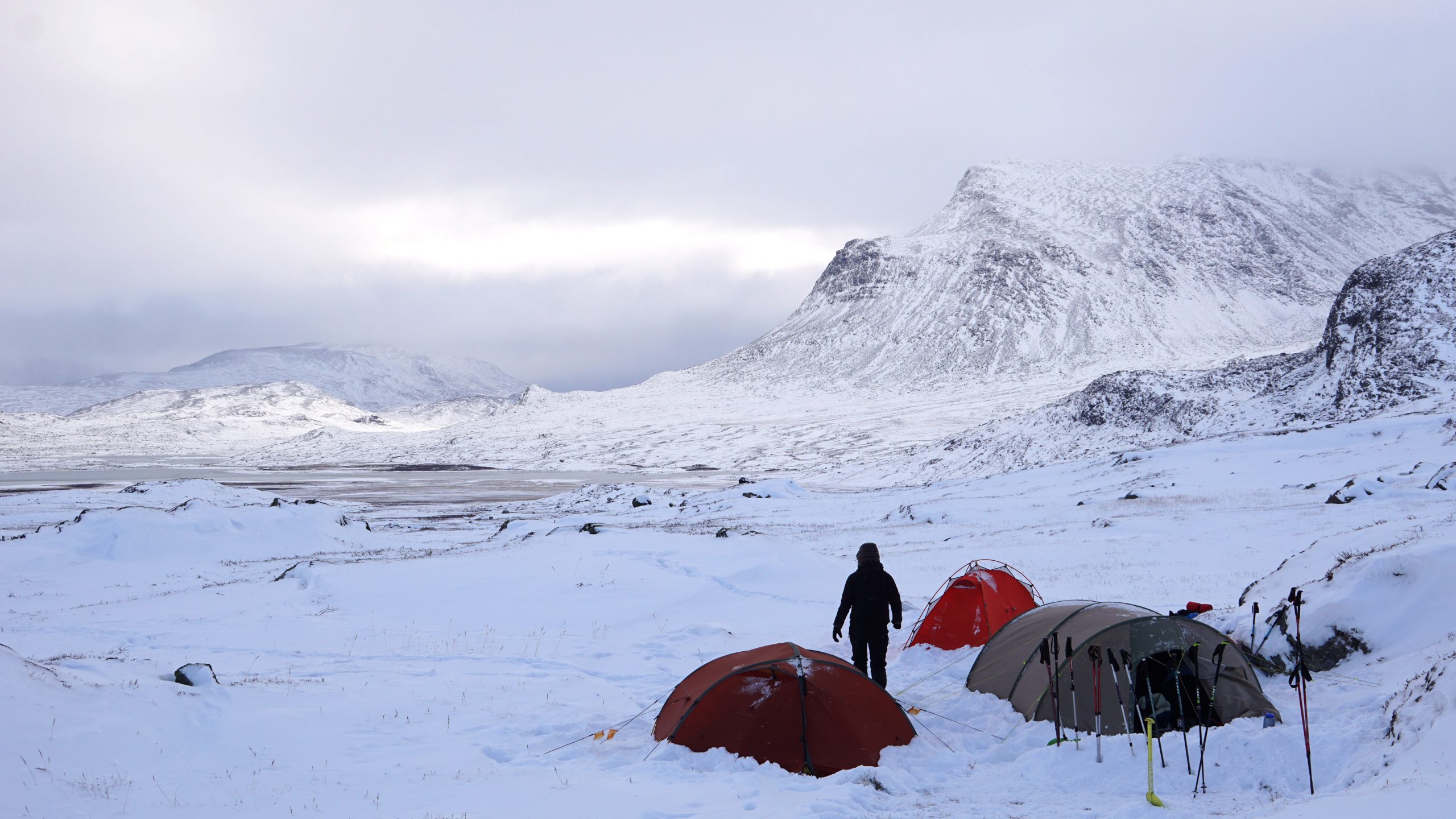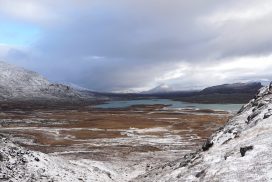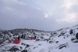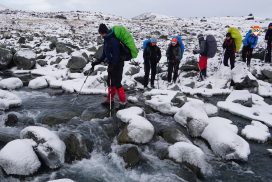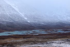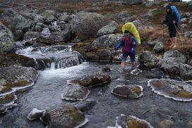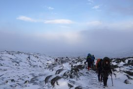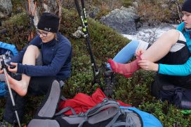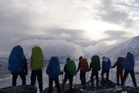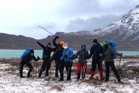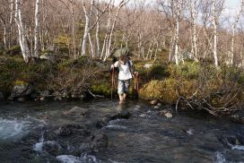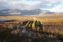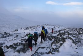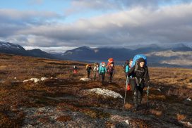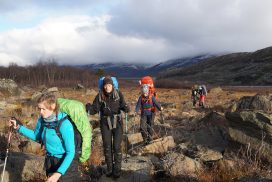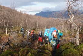 Am ersten Herbstferientag trafen wir uns am Berliner Bahnhof-Südkreuz, fuhren mit unserem gemieteten Van nach Rostock und nahmen die Nachtfähre nach Trelleborg. Die nächsten zwei Tage fuhren wir Auto, immer mit guter Laune und vielen Ideen, sich die Zeit zu vertreiben. Abends campierten wir, weil wir nicht durch die Nacht fahren wollten. Am zweiten Abend schlugen wir unser Lager am Rande des Nationalparks auf. Am ersten Tag gingen wir schon 18 km in den Nationalpark hinein. Der erste Teil unserer Strecke führte durch eine farbenfrohe Heide, durch Bäume, Moos, und viele Blaubeeren und Preiselbeeren. Auf der Hälfte der Strecke sahen wir nach einem leichten Anstieg Schnee. Nun waren wir auf dem Fjell, einer großen weißen Schneelandschaft mit viel Wind. Der Weg stellte uns an einigen Stellen direkt auf die Probe. Im Nationalpark gibt es abgesehen von den Rentierpfaden keine Wege. Außerdem mussten wir zwei Flüsse furten, was Überwindung und Geschick erforderte. Niklas, der uns führte, ging mit einem Seil voran. Als er die andere Seite erreicht hatte, wurde das Seil gespannt und wir wateten einer nach dem Anderen auf die Stöcke gestützt, barfuß und knietief durch den eisigen Strom. Abends schlugen wir ein Camp auf und alle beschäftigten sich mit ihren jeweiligen Verantwortungen. Es wurden Zelte aufgebaut, Wasser geholt, gekocht und sich in den Zelten eingerichtet. Es gab zwei Zweipersonen-Zelte und ein Fünfpersonen-Zelt, welches wir auch als Gruppenzelt zum Essen und zum Abhalten der Tagesreflektionen nutzten. Jeden Abend hielten wir dieses Ritual ab, um die Ereignisse des Tages auszuwerten. Abends aßen wir Linsen, Nudeln, Polenta, Couscous, Reis mit Pilzen und andere leichte und leckere Gerichte. Außerdem tranken wir morgens, mittags und abends Tee. Wir standen jeden Morgen um 6 Uhr auf, frühstückten, zwängten uns in unsere vereisten Schuhe, bauten die Zelte ab und machten uns auf den Weg. Wir wanderten möglichst ohne lange Pausen. Nur zum Austreten – natürlich in freier Wildbahn – und für eine Mittagessenspause hielten wir inne. Die Temperaturen von bis zu -5 Grad am Tag und bis zu -17 Grad in der Nacht machten uns sehr zu schaffen und wir versuchten uns bestmöglich warmzuhalten. Durch das Wetter und andere Umstände änderte sich unsere Route an manchen Stellen leicht, aber sie blieb immer interessant. An manchen Tagen ließen wir unser Lager aufgebaut und unternahmen Touren nur mit dem nötigsten Gepäck. Wir sahen atemberaubende Schneelandschaften, manchmal auch eine verlassene Hütte mitten in der Wildnis und Tiere wie einen Elch, Rentiere oder Schneehühner. Einmal schliefen wir auf einem kleinen Berg. Um Tee und Essen machen zu können brauchten wir Wasser, welches wir mit auf den Berg nehmen mussten. Das war eine mühsame Angelegenheit, doch für diesen Ausblick lohnte es sich. Im Großen und Ganzen ließ es sich ohne Wege gut wandern, an manchen Stellen war das Durchkommen aber schwer. Es gab Sümpfe, verborgen unter Schnee und Eis und auch viele kleine Bäche, die von den Bergen hinab in Seen und Flüsse mündeten, weswegen wir oft nasse Füße hatten. Oft schlug uns auch das Wetter ein Schnippchen. Es kam vor, dass wir aus dem schlechten Wetter ins noch schlechtere Wetter flohen und sahen, wie es hinter uns wieder aufklarte. Gegen Ende der Tour hinderten uns der Wintereinbruch und das Wetter am Besteigen eines Gipfels und wir machten uns auf den Rückweg. Insgesamt verbrachten wir 8 Tage und 7 Nächte in freier Wildbahn.