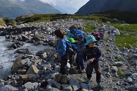 In den nächsten Tagen unternahmen wir mit den Kindern zahlreiche Wanderungen. Lohnende Ziele waren die Seen der Umgebung, aber auch jeder Wasserlauf, jede Brücke wurde zum Abenteuer. Weit musste man mit den Kindern nie laufen. Ständig gab es etwas zu sehen. Große Steine, noch größere Steine, Steinmännchen. Besonders beliebt waren auch Kaulquappen und Frösche. Sogar einen Adler haben wir gesehen. Mit den größeren Kindern haben wir einen versicherten Steig getestet und eine Anhöhe des Stubaier Höhenwegs, das Niederle, erreicht. Mein persönlicher Höhepunkt war die gemeinsame Wanderung zum Sulzenauferner, dem Gletscher rund zwei Stunden oberhalb der Hütte. Markierungen zeigten den Rückgang des Gletschers in den letzten zwanzig Jahren. Direkter kann man nicht erfahren, was Klimaerwärmung bedeutet. Die Eltern haben sich den Aperen Freiger (anstrengend) oder den abenteuerlichen Klettersteig durch die Sulzenauschlucht direkt bei der Hütte vorgenommen.