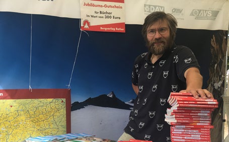 Unser Stand mit Tourenberatungen und dazu natürlich allerlei Karten und Wanderführern war rege besucht und beliebt bis zu zeitweisen Belagerungen – wie gut, dass noch Renate und Christoph zur Tourenberatung dazukamen. So konnten wir gemeinsam die brennendsten Fragen unserer Besucher löschen. Mit der freundlichen Spende vom Bergverlag Rother waren wir auch mit ganz frischer, noch dampfender Literatur vor Ort. So waren wir insgesamt ganz zufrieden. Aber wir haben gelernt: Als windfeste Dekoration eignen sich keine Landkarten…